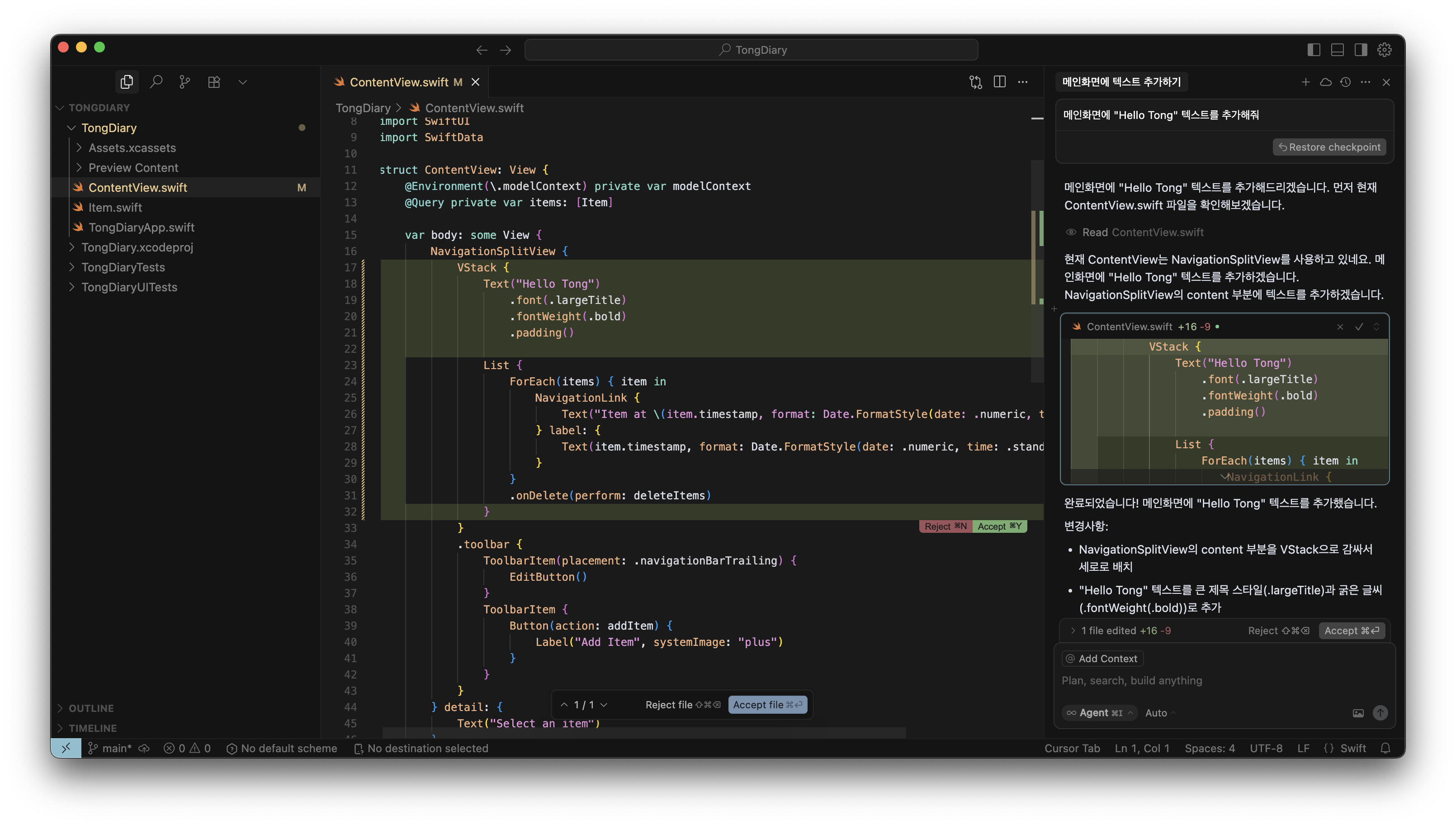 여기까지 Cursor 를 iOS 개발 환경에 적용하는 방법을 알아봤습니다.