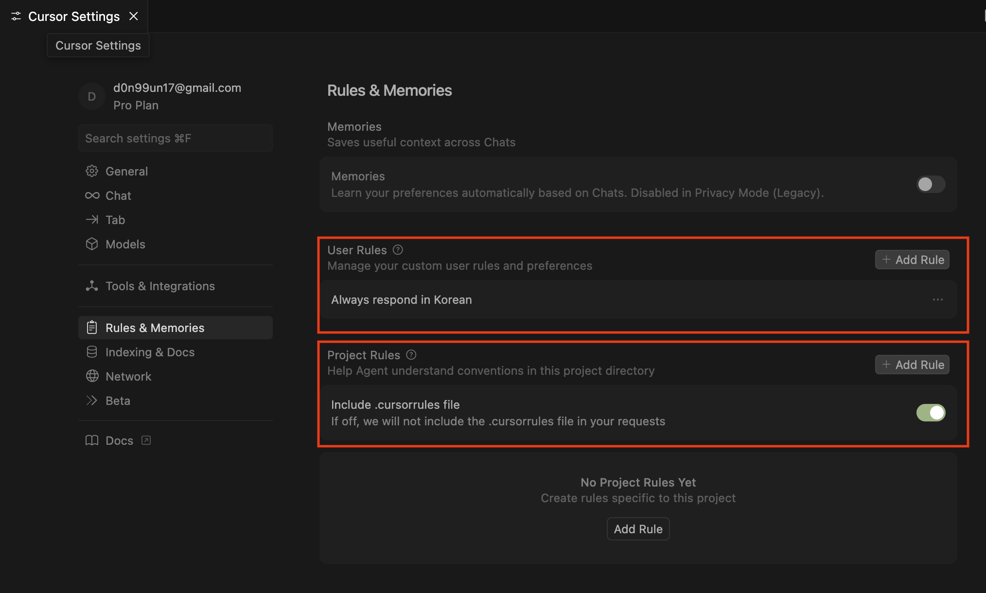 설정을 적용하려면 Cursor 세팅 항목 중 Rules & Memories 라는 탭에서 아래와 같은 화면을 보실 수 있으실겁니다.